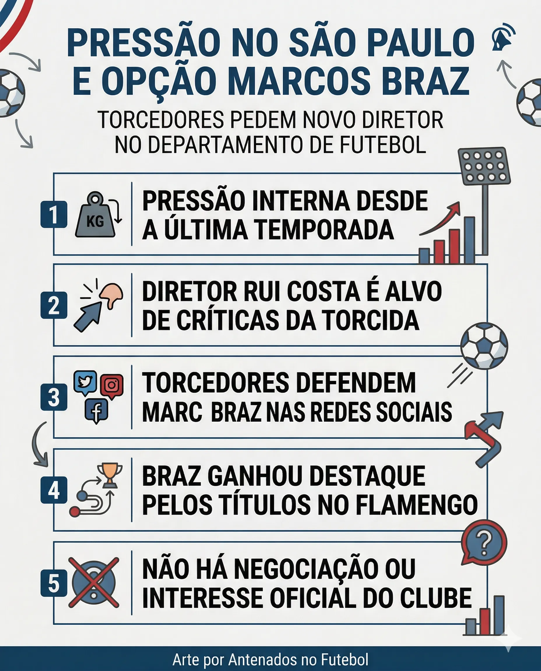 O São Paulo vive um momento de pressão interna desde a última temporada, com questionamentos sobre a gestão no departamento de futebol. Um dos nomes mais cobrados é o diretor Rui Costa, alvo de críticas por parte da torcida.