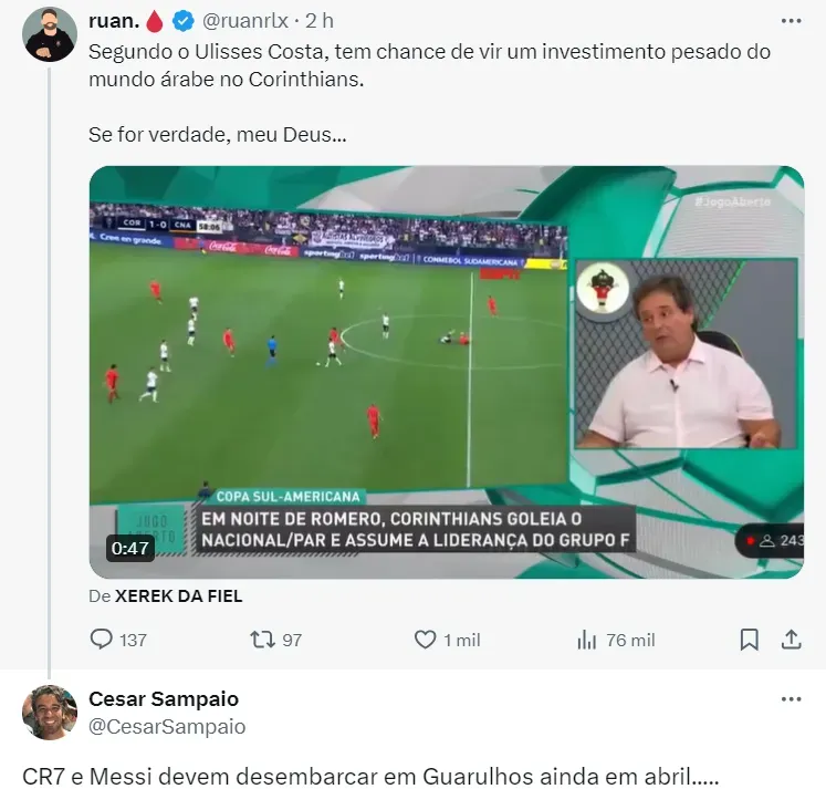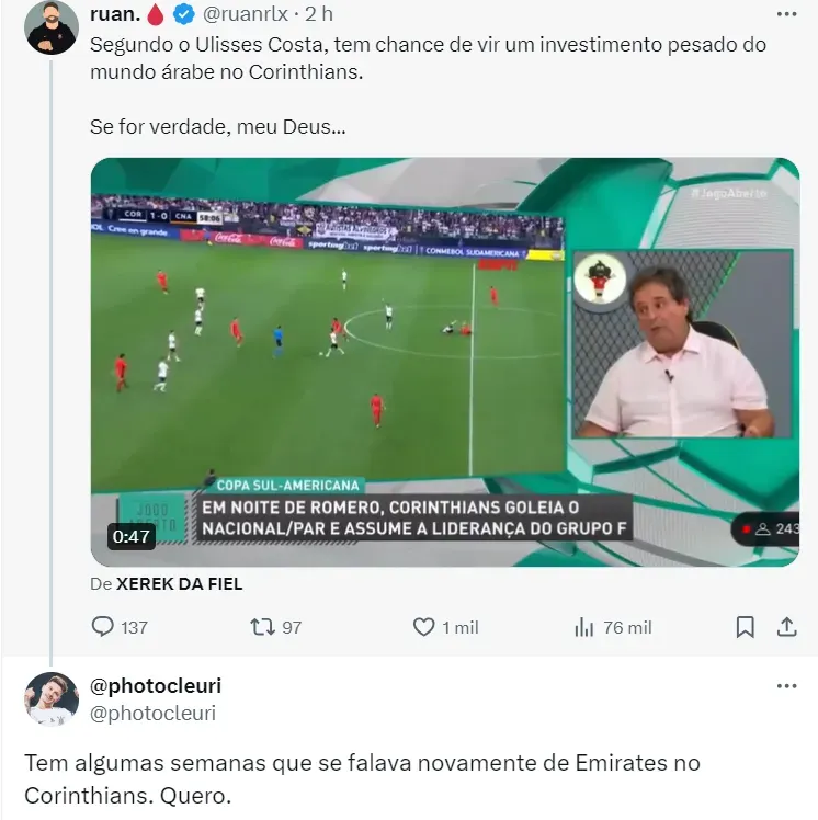 “Falam que talvez em termos de investimentos, vem uma bomba gigantesca para o Corinthians do mundo árabe. Talvez uma grande parceria, mas grande, grande mesmo, talvez a maior da América”, iniciou.