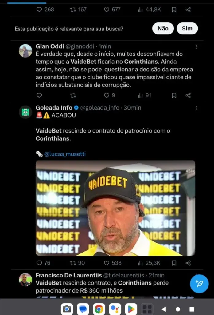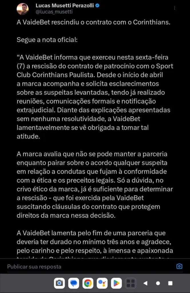 “A VaideBet informa que exerceu nesta sexta-feira (7) a rescisão do contrato de patrocínio com o Sport Club Corinthians Paulista. Desde o início de abril a marca acompanha e solicita esclarecimentos sobre as suspeitas levantadas, tendo já realizado reuniões, comunicações formais e notificação extrajudicial. Diante das explicações apresentadas sem nenhuma resolutividade, a VaideBet lamentavelmente se vê obrigada a tomar tal atitude”, iniciou.