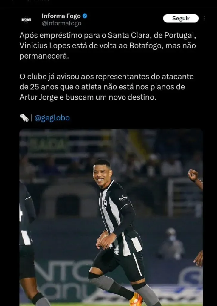 No entanto, o Alvinegro Carioca já comunicou aos representantes do jogador que não tem a intenção de integrá-lo ao elenco principal. Diante dessa situação, busca-se um novo destino para Vinícius Lopes.