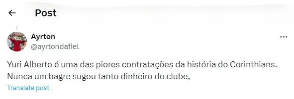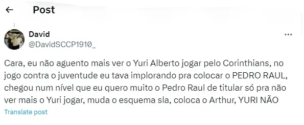 Ainda citando ess péssima fase do Alvinegro, além da pressão contra Cássio, Fagner e cia, outro jogador virou alvo da torcida na web: trata-se do centroavante Yuri Alberto. Sendo assim, os seguintes comentários contra o titular vieram à tona (SIC).