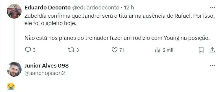 Dessa forma, nos últimos dias, foi especulado entre os torcedores são-paulinos possíveis oportunidades para o jovem Young, que é muito bem visto internamente. Porém, Zubeldía ‘acabou’ com as especulações e afirmou que o titular de fato será Jandrei durante o período de ausência do Rafael.