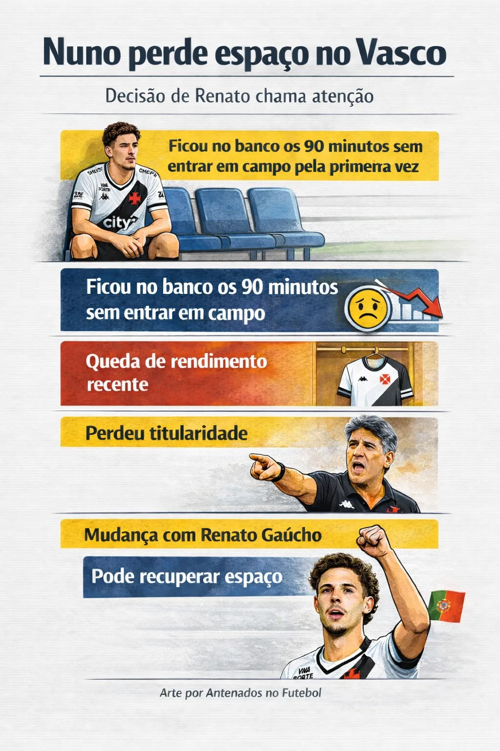 Ainda assim, é precipitado tratar o meia como uma opção descartável neste momento. Com qualidade técnica comprovada, Nuno Moreira pode voltar a ser útil, especialmente se conseguir se adaptar ao modelo de jogo de Renato Gaúcho. Cabe à comissão técnica encontrar a melhor forma de reintegrá-lo, enquanto o jogador precisa responder em campo para recuperar espaço e confiança.
